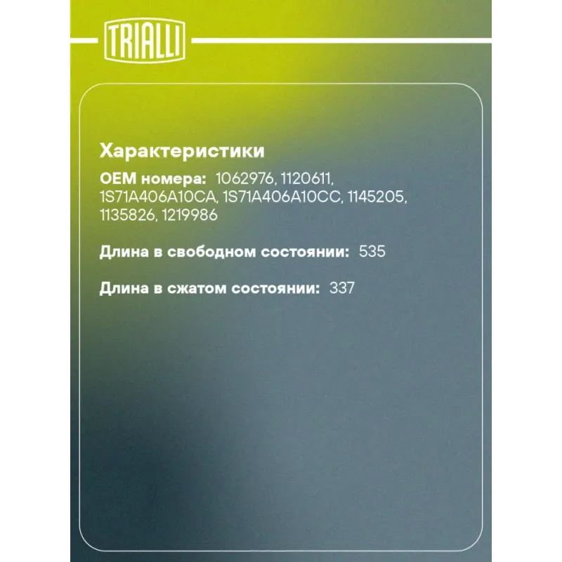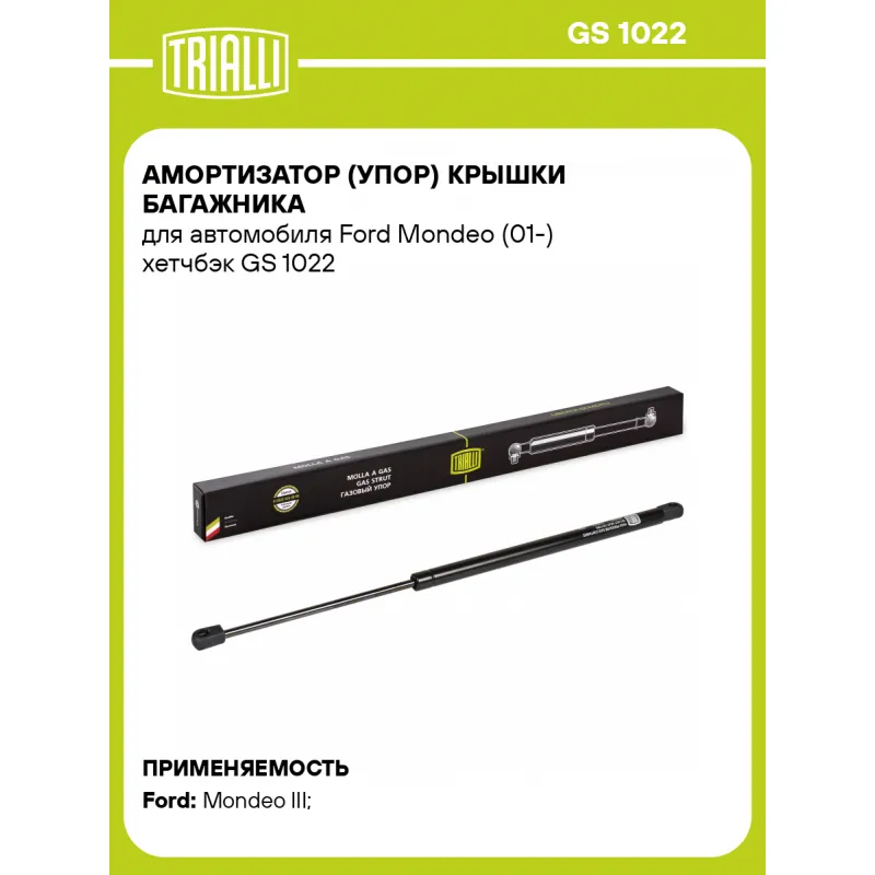 Амортизатор (упор) крышки багажника для автомобиля Ford Mondeo (01-) хетчбэк Характеристики: Артикул: GS 1022 OEM номера: 1062976, 1120611, 1S71A406A10CA, 1S71A406A10CC, 1145205, 1135826, 1219986 Товарная линейка: BLACK Количество на автомобиль: 2 Гарантийный срок: 2 года / 60 000 км Длина в свободном состоянии: 535 Длина в сжат... Читать полностью →