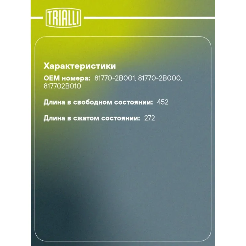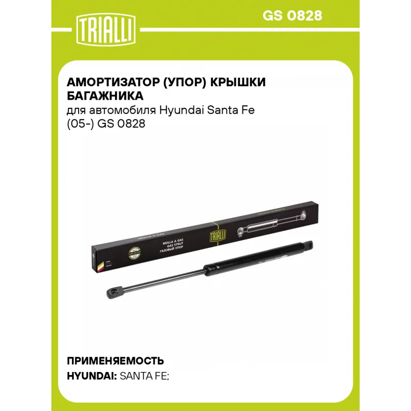 Амортизатор (упор) крышки багажника для автомобиля Hyundai Santa Fe (05-) Характеристики: Артикул: GS 0828 OEM номера: 81770-2B001, 81770-2B000, 81770-2B010 Товарная линейка: BLACK Количество на автомобиль: 2 Гарантийный срок: 2 года / 60 000 км Длина в свободном состоянии: 452 Длина в сжатом состоянии: 272 Ход поршня: 180 Усилие в точке P3: 660 Комплектация: Амортизатор (упор) крышки багажника - 1 шт Гарантия: от 1 года.