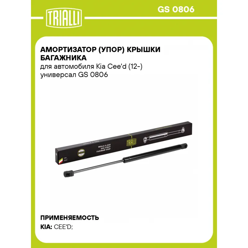 Амортизатор (упор) крышки багажника для автомобиля Kia Cee'd (12-) универсал Характеристики: Артикул: GS 0806 OEM номера: 81780A2200, 81770A2200 Товарная линейка: BLACK Количество на автомобиль: 2 Гарантийный срок: 2 года / 60 000 км Длина в свободном состоянии: 446 Длина в сжатом состоянии: 258 Ход поршня: 188 Усилие в точ... Читать полностью →