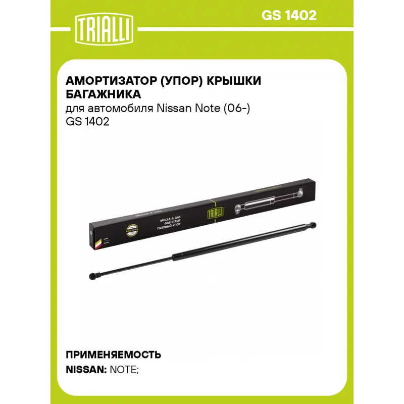 Амортизатор (упор) крышки багажника для автомобиля Nissan Note (06-) Характеристики: Артикул: GS 1402 OEM номера: 90450-9U00A Товарная линейка: BLACK Количество на автомобиль: 2 Гарантийный срок: 2 года / 60 000 км Длина в свободном состоянии: 590 Длина в сжатом состоянии: 410 Ход поршня: 180 Усилие в точке P3: 425 Комплектация: Амортизатор (упор) крышки багажника - 1 шт Гарантия: от 1 года.