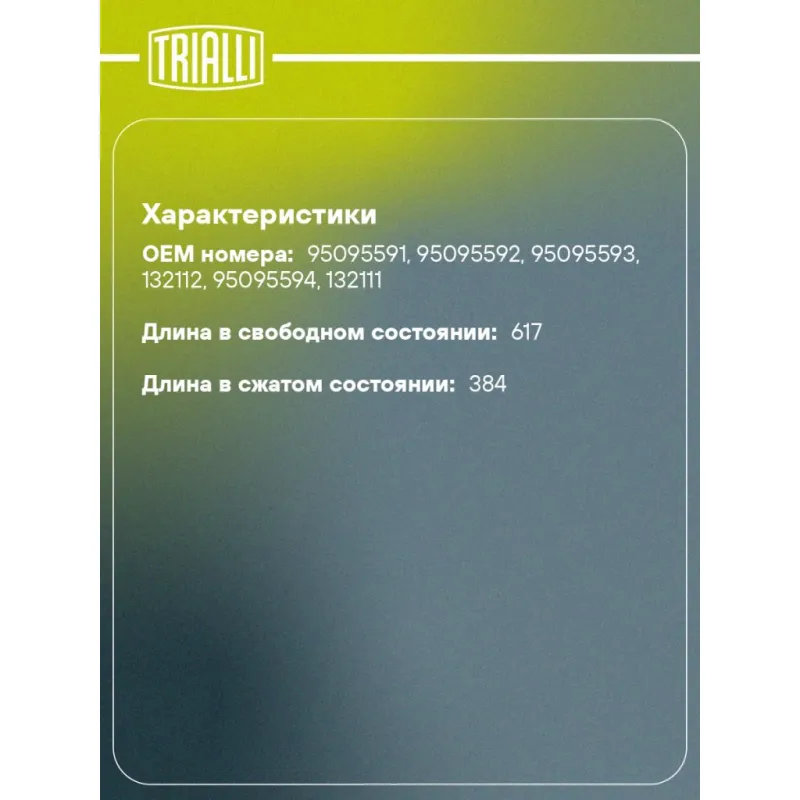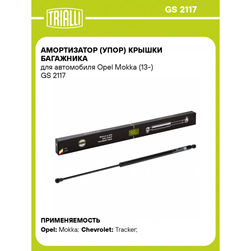 Амортизатор (упор) крышки багажника для автомобиля Opel Mokka (13-) Характеристики: Артикул: GS 2117 OEM номера: 95095591, 95095592, 95095593, 132112, 95095594, 132111 Товарная линейка: BLACK Количество на автомобиль: 2 Гарантийный срок: 2 года / 60 000 км Длина в свободном состоянии: 617 Длина в сжатом состоянии: 384 Ход поршня: 233 Усилие в точке P3: 370 Подходит для авто: Opel Mokka (13-) Chevrolet Tracker (13-) Для проверки применяемости отправьте VIN автомобиля через вкладку "Есть вопросы о товаре?" Комплектация: Амортизатор (упор) крышки багажника - 1 шт Гарантия: от 1 года.