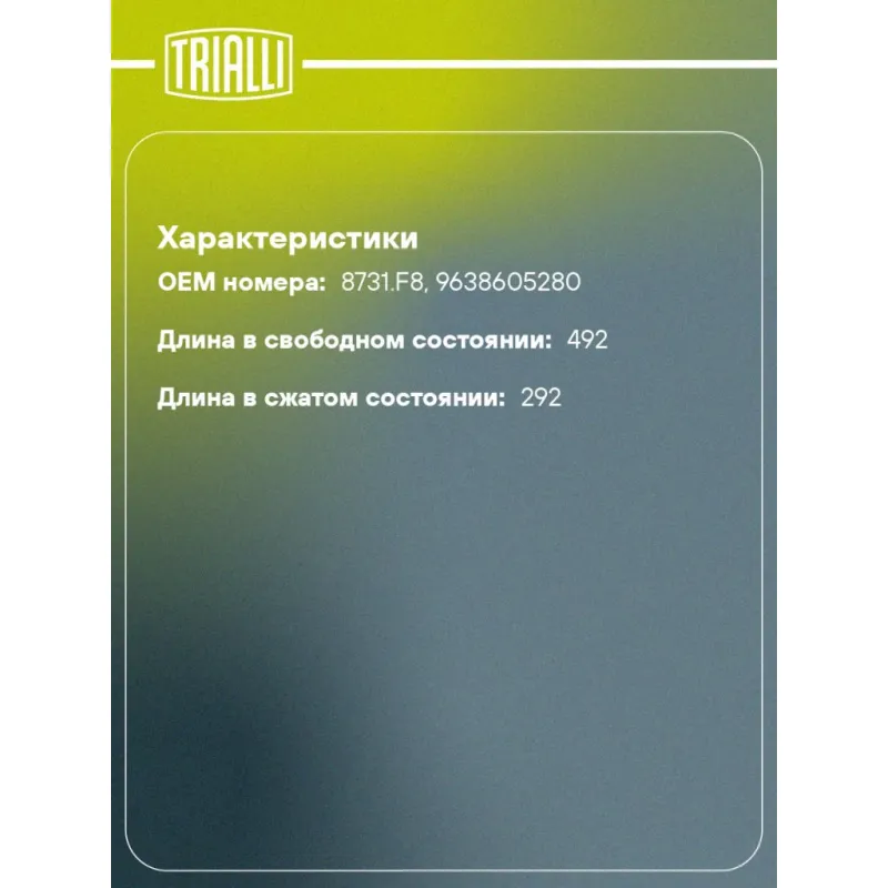 Амортизатор (упор) крышки багажника для автомобиля Peugeot 307 (00-) универсал Характеристики: Артикул: GS 2012 OEM номера: 8731.F8, 9638605280 Товарная линейка: BLACK Количество на автомобиль: 2 Гарантийный срок: 2 года / 60 000 км Длина в свободном состоянии: 492 Длина в сжатом состоянии: 292 Ход поршня: 200 Усилие в точке P3:... Читать полностью →