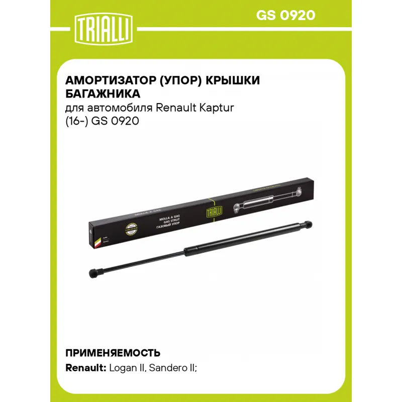 Амортизатор (упор) крышки багажника для автомобиля Renault Kaptur (16-) Характеристики: Артикул: GS 0920 OEM номера: 844301324R, 7000210540E0 Товарная линейка: BLACK Количество на автомобиль: 2 Гарантийный срок: 2 года / 60 000 км Длина в свободном состоянии: 476 Длина в сжатом состоянии: 306 Ход поршня: 170 Усилие в точке P3: 620 Подходит для авто: Renault Logan II (12-), Sandero II (14-), Logan II (12-), Sandero II (14-) Для проверки применяемости отправьте VIN автомобиля через вкладку "Есть вопросы о товаре?" Комплектация: Амортизатор (упор) крышки багажника - 1 шт Гарантия: от 1 года.