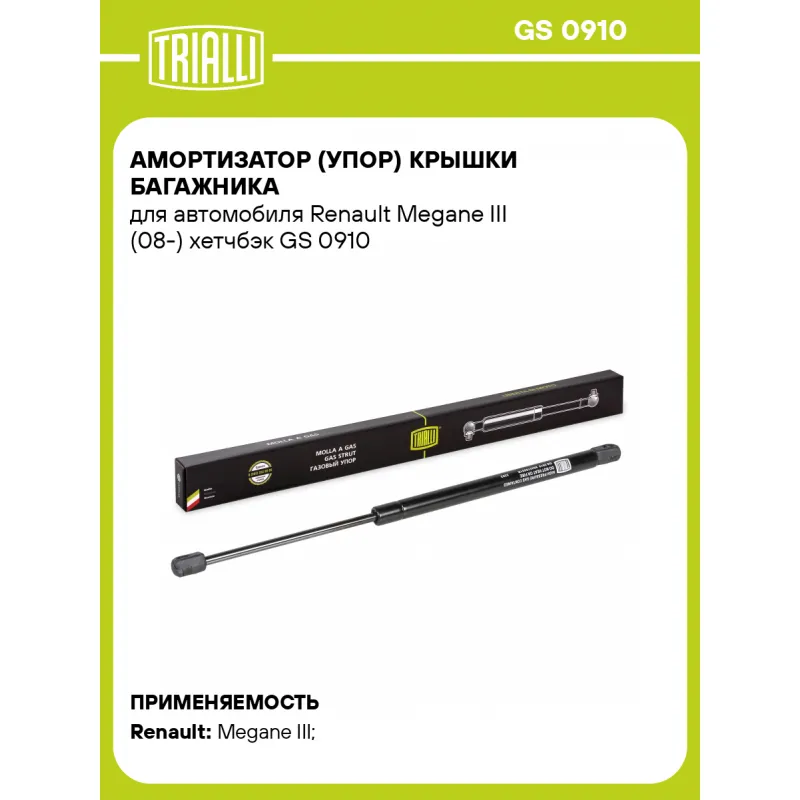Амортизатор (упор) крышки багажника для автомобиля Renault Megane III (08-) хетчбэк Характеристики: Артикул: GS 0910 OEM номера: 904510001R Товарная линейка: BLACK Количество на автомобиль: 2 Гарантийный срок: 2 года / 60 000 км Длина в свободном состоянии: 432 Длина в сжатом состоянии: 270 Ход поршня: 162 Усилие в точке P3: 600 Подходит для авто: Renault Megane III (08-), Megane III (08-) Для проверки применяемости отправьте VIN автомобиля через вкладку "Есть вопросы о товаре?" Комплектация: Амортизатор (упор) крышки багажника - 1 шт Гарантия: от 1 года.