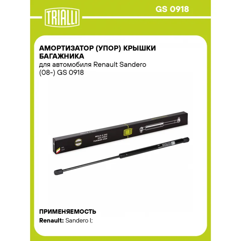 Амортизатор (упор) крышки багажника для автомобиля Renault Sandero (08-) Характеристики: Артикул: GS 0918 OEM номера: 8200735264 Товарная линейка: BLACK Количество на автомобиль: 2 Гарантийный срок: 2 года / 60 000 км Длина в свободном состоянии: 520 Длина в сжатом состоянии: 295 Ход поршня: 225 Усилие в точке P3: 370 Подходит для авто: Renault Sandero I (09-), Sandero I (09-) Для проверки применяемости отправьте VIN автомобиля через вкладку "Есть вопросы о товаре?" Комплектация: Амортизатор (упор) крышки багажника - 1 шт Гарантия: от 1 года.