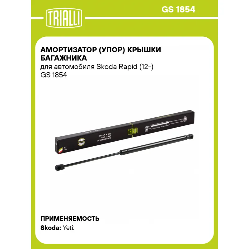 Амортизатор (упор) крышки багажника для автомобиля Skoda Rapid (12-) Характеристики: Артикул: GS 1854 OEM номера: 5JA 827 550, 5JA 827 550 D Товарная линейка: BLACK Количество на автомобиль: 2 Гарантийный срок: 2 года / 60 000 км Длина в свободном состоянии: 521 Длина в сжатом состоянии: 316 Ход поршня: 205 Усилие в точке P3: 560 Подходит для авто: Skoda Yeti (09-), Yeti (09-) Для проверки применяемости отправьте VIN автомобиля через вкладку "Есть вопросы о товаре?" Комплектация: Амортизатор (упор) крышки багажника - 1 шт Гарантия: от 1 года.
