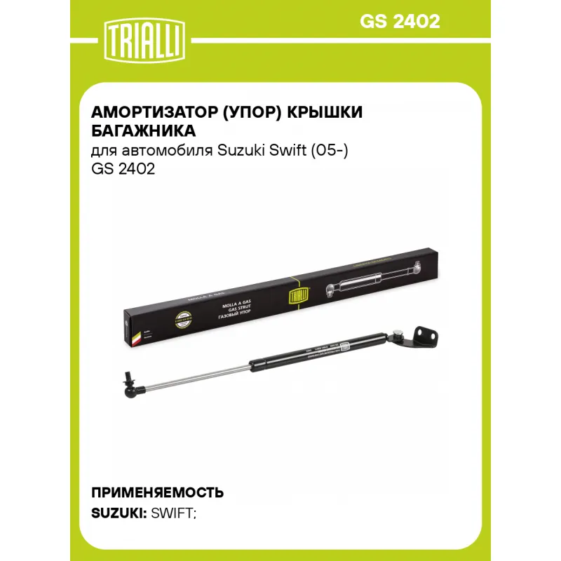 Амортизатор (упор) крышки багажника для автомобиля Suzuki Swift (05-) Характеристики: Артикул: GS 2402 OEM номера: 81801-62811, 81801-62810 Товарная линейка: BLACK Парный товар: GS 2401 Количество на автомобиль: 2 Гарантийный срок: 2 года / 60 000 км Длина в свободном состоянии: 440 Длина в сжатом состоянии: 275 Ход поршня: 165 Усилие в точке P3: 410 Комплектация: Амортизатор (упор) крышки багажника - 1 шт Гарантия: от 1 года.
