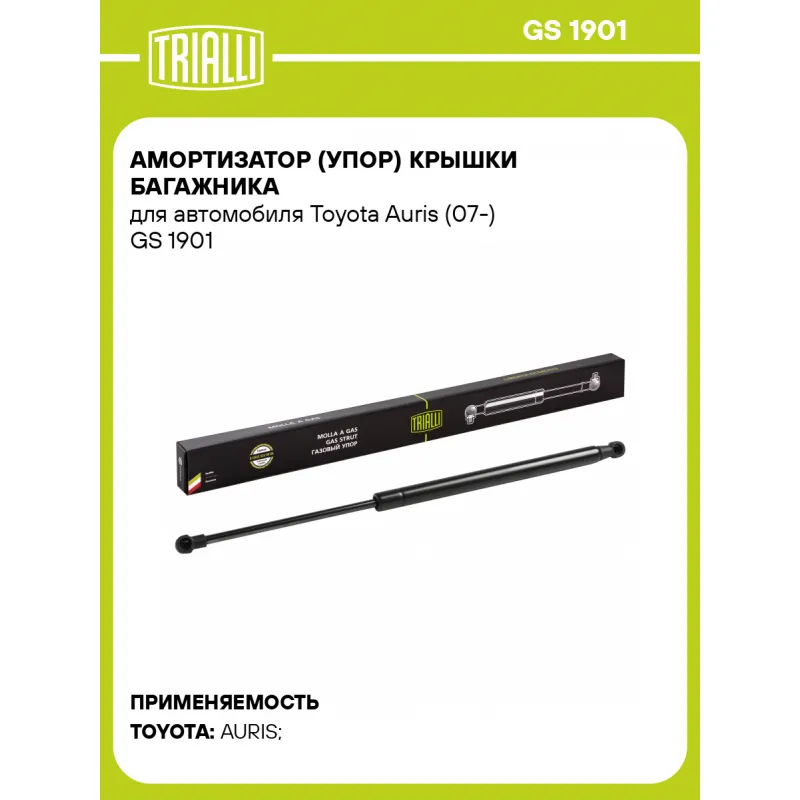 Амортизатор (упор) крышки багажника для автомобиля Toyota Auris (07-) Характеристики: Артикул: GS 1901 OEM номера: 68950-02090, 68950-02091, 68960-02080, 68960-02081 Товарная линейка: BLACK Количество на автомобиль: 2 Гарантийный срок: 2 года / 60 000 км Длина в свободном состоянии: 443,5 Длина в сжатом состоянии: 278,5 Ход поршня: 165 Усилие в точке P3: 455 Комплектация: Амортизатор (упор) крышки багажника - 1 шт Гарантия: от 1 года.
