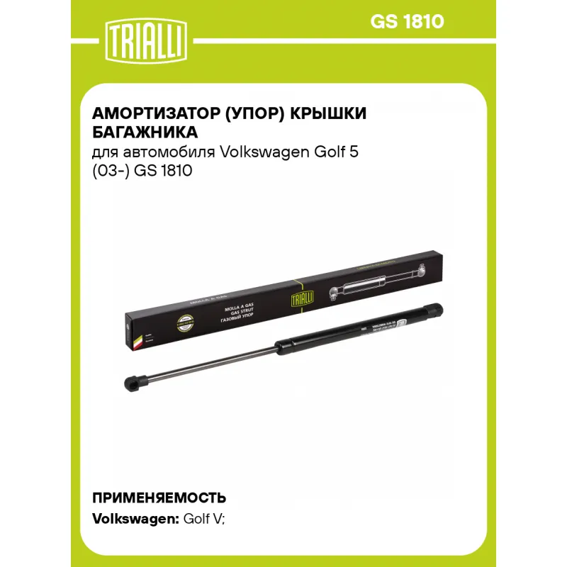 Амортизатор (упор) крышки багажника для автомобиля Volkswagen Golf 5 (03-) Характеристики: Артикул: GS 1810 OEM номера: 1K6827550F, 1K6827550A, 1K6827550B, 1K6827550D, 1K6827550E Товарная линейка: BLACK Количество на автомобиль: 2 Гарантийный срок: 2 года / 60 000 км Длина в свободном состоянии: 450 Длина в сжатом состоянии: 272 Ход поршня: 178 Усилие в точке P3: 535 Подходит для авто: Volkswagen Golf V (03-), Golf V (03-) Для проверки применяемости отправьте VIN автомобиля через вкладку "Есть вопросы о товаре?" Комплектация: Амортизатор (упор) крышки багажника - 1 шт Гарантия: от 1 года.