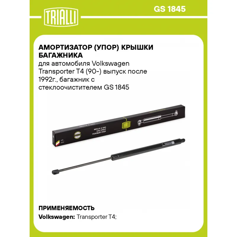 Амортизатор (упор) крышки багажника для автомобиля Volkswagen Transporter T4 (90-) выпуск после 1992г., багажник с стеклоочистителем Характеристики: Артикул: GS 1845 OEM номера: 701829331AB, 7D0829331F, 701829331S Товарная линейка: BLACK Количество на автомобиль: 2 Гарантийный срок: 2 года / 60 000 км Длина в свободном состоянии: 686 Длина в сжатом состоянии: 433 Ход поршня: 253 Усилие в точке P3: 910 Подходит для авто: Volkswagen Transporter T4 (90-), Transporter T4 (90-) Для проверки применяемости отправьте VIN автомобиля через вкладку "Есть вопросы о товаре?" Комплектация: Амортизатор (упор) крышки багажника - 1 шт Гарантия: от 1 года.