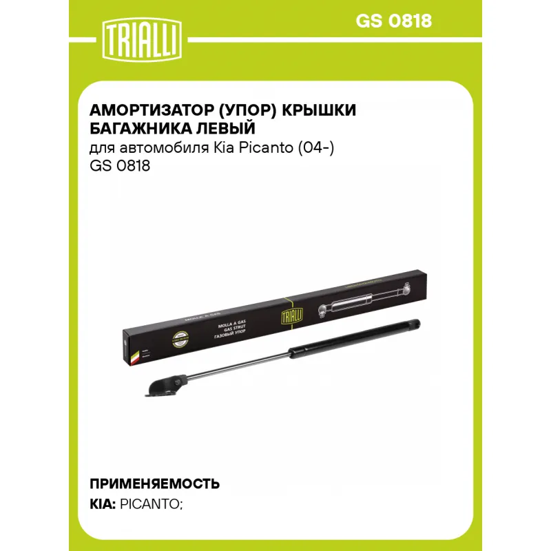 Амортизатор (упор) крышки багажника левый для автомобиля Kia Picanto (04-) Характеристики: Артикул: GS 0818 OEM номера: 81770-07000, 81770-07020, 81770-07021, 81770-07001 Товарная линейка: BLACK Парный товар: GS 0819 Количество на автомобиль: 2 Гарантийный срок: 2 года / 60 000 км Длина в свободном состоянии: 478 Длина в сжатом состоянии: 285 Ход поршня: 193 Усилие в точке P3: 335 Комплектация: Амортизатор (упор) крышки багажника - 1 шт Гарантия: от 1 года.