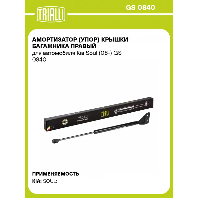 Амортизатор (упор) крышки багажника правый для автомобиля Kia Soul (08-) Характеристики: Артикул: GS 0840 OEM номера: 81780-2K000 Товарная линейка: BLACK Парный товар: GS 0839 Количество на автомобиль: 2 Гарантийный срок: 2 года / 60 000 км Длина в свободном состоянии: 456 Длина в сжатом состоянии: 271 Ход поршня: 185 Усилие в точке P3: 330 Комплектация: Амортизатор (упор) крышки багажника - 1 шт Гарантия: от 1 года.