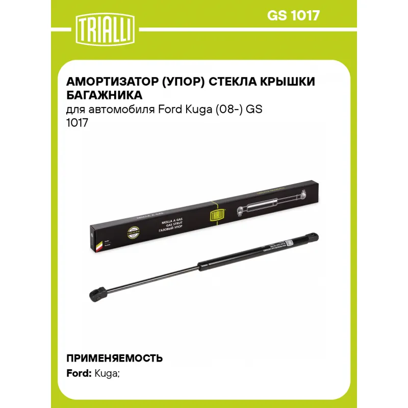 Амортизатор (упор) стекла крышки багажника для автомобиля Ford Kuga (08-) Характеристики: Артикул: GS 1017 OEM номера: 8V41S406A10BB, 1520777, 1496160, 1684313, 1708365 Товарная линейка: BLACK Количество на автомобиль: 2 Гарантийный срок: 2 года / 60 000 км Длина в свободном состоянии: 485 Длина в сжатом состоянии: 295 Ход поршня: 190 Усилие в точке P3: 200 Подходит для авто: Ford Kuga (08-) Для проверки применяемости отправьте VIN автомобиля через вкладку "Есть вопросы о товаре?" Комплектация: Амортизатор (упор) крышки багажника - 1 шт Гарантия: от 1 года.