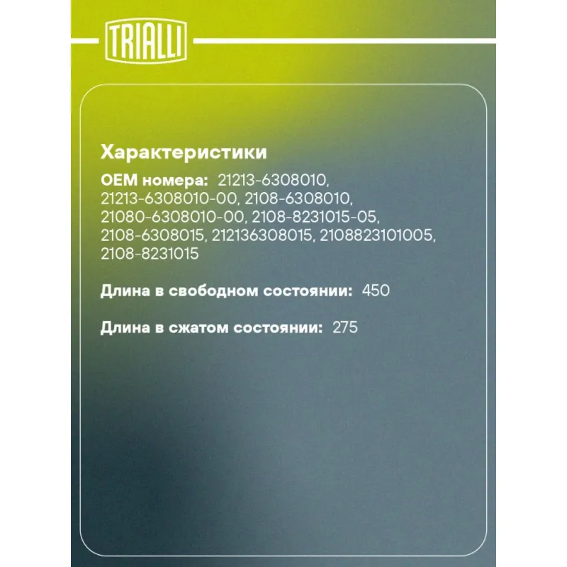 Амортизатор (упор) задней двери для автомобиля Лада 2108/2114/21213 Характеристики: Артикул: GS 0102 OEM номера: 2108-8231010, 21080-8231010-05, 21213-8231010-05, 21213-8231010, 21213-6308010, 21213-6308010-00, 2108-6308010, 21080-6308010-00, 2108-8231010-05, 2108-8231015-05, 2108-6308015, 2108-8231015, 21213-8231015, 21213-6308015 Товарная линейка: BLACK Количество на автомобиль: 2 Гарантийный срок: 2 года / 60 000 км Длина в свободном состоянии: 450 Длина в сжатом состоянии: 275 Ход поршня: 175 Усилие в точке P3: 360 Подходит для авто: ВАЗ 2108, 2109, 2113, 2114, 1111 (Ока), 2131, 21213, 2108, 2108, 2109, 2109, 2131, 2131, 21213, 21214 IZH 2126 ЗАЗ 1102 Для проверки применяемости отправьте VIN автомобиля через вкладку "Есть вопросы о товаре?" Комплектация: Амортизатор (упор) задней двери - 1 шт Гарантия: от 1 года.