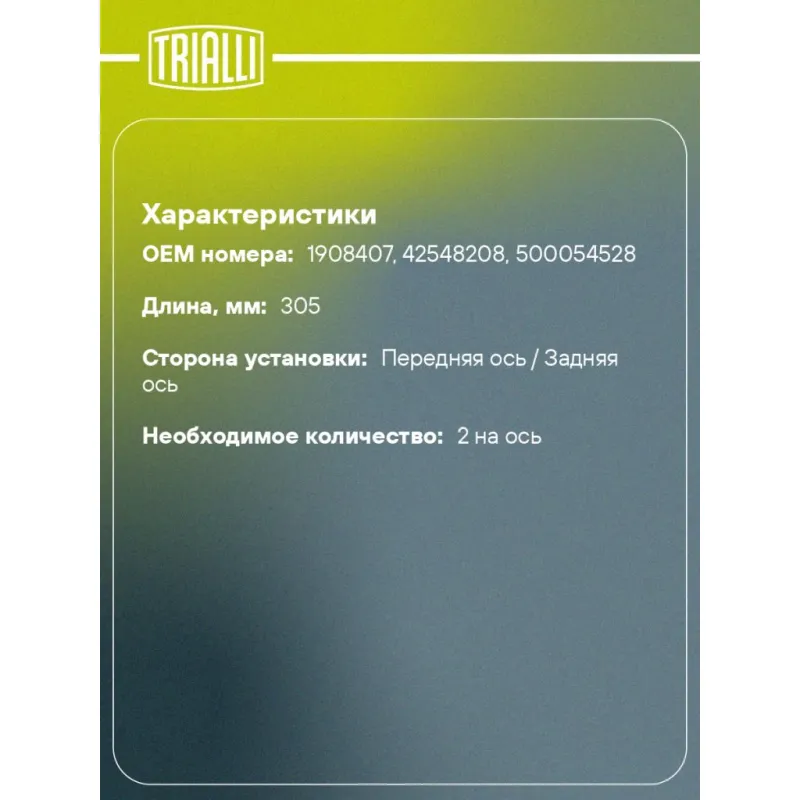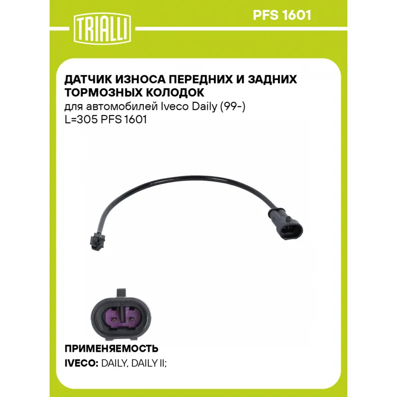 Датчик износа передних и задних тормозных колодок для автомобилей Iveco Daily (99-) L=305 Характеристики: Артикул: PFS 1601 OEM номера: 1908407, 42548208, 500054528 Необходимое количество: 2 на ось Количество на автомобиль: 2 Сопутствующие товары:: PF 1601 Длина, мм: 305 Сторона установки: Передняя ось / Задняя ось Гарантийный с... Читать полностью →
