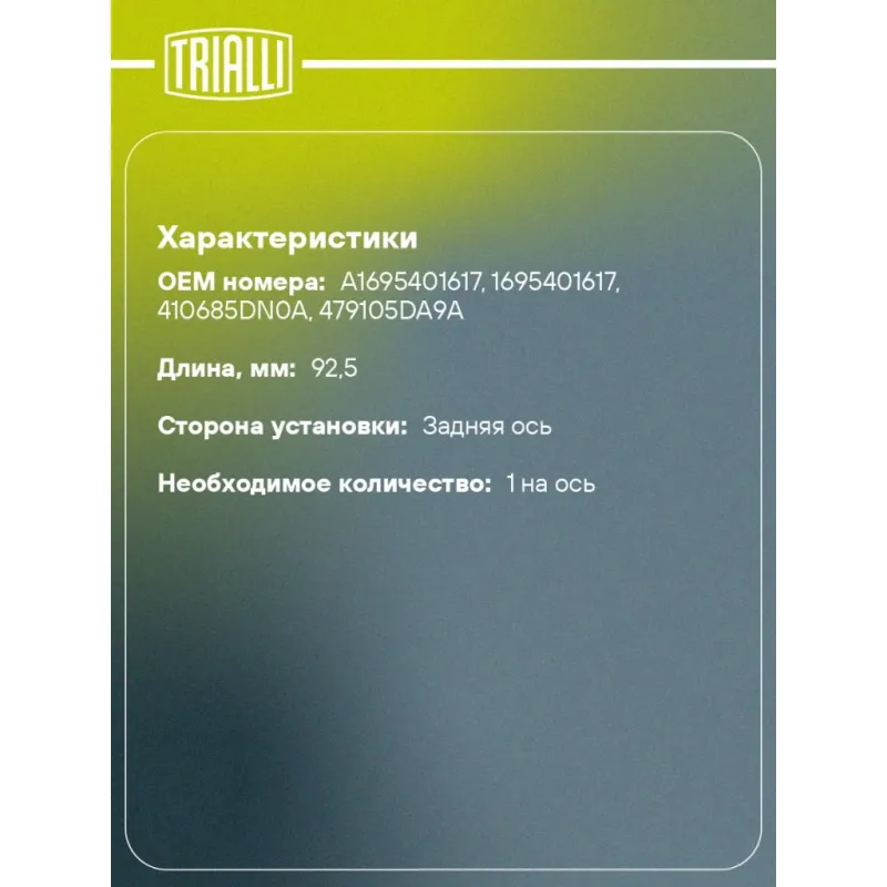 Датчик износа передних и задних тормозных колодок для автомобилей Mercedes A (12-) / C (14-) / E (16-) / CLA (13-) Характеристики: Артикул: PFS 4067 OEM номера: A1695401617, 1695401617, 410685DN0A, 479105DA9A Необходимое количество: 1 на ось Количество на автомобиль: 1 Сопутствующие товары:: PF 4067 Длина, мм: 92,5 Сторона установки: Задняя ось Гарантийный срок: 1 год / 30 000 км Товарная линейка: BLACK Комплектация: Датчик износа - 1 шт Гарантия: от 1 года.