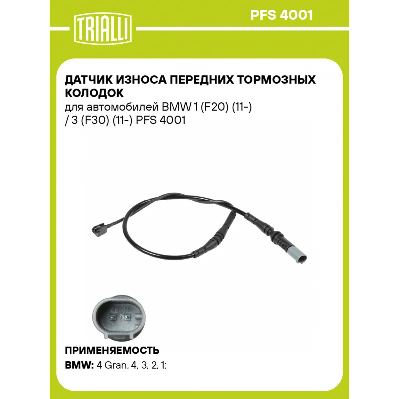 Датчик износа передних тормозных колодок для автомобилей BMW 1 (F20) (11-) / 3 (F30) (11-) Характеристики: Артикул: PFS 4001 OEM номера: 34356792289 Необходимое количество: 1 на ось Количество на автомобиль: 1 Сопутствующие товары:: PF 4001 Длина, мм: 675 Сторона установки: Передняя ось Гарантийный срок: 1 год / 30 000 км Товарн... Читать полностью →