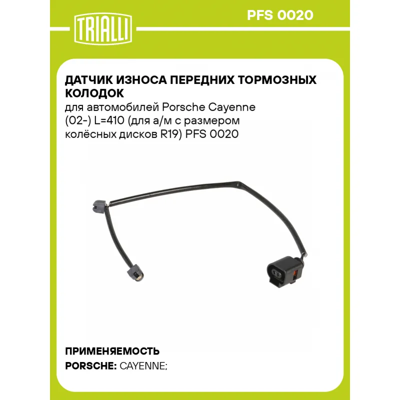 Датчик износа передних тормозных колодок для автомобилей Porsche Cayenne (02-) L=410 (для а/м с размером колёсных дисков R19) Характеристики: Артикул: PFS 0020 OEM номера: 95561236550 Длина, мм: 410 Сторона установки: Передняя ось Необходимое количество: 2 на ось Количество на автомобиль: 2 Гарантийный срок: 1 год / 30.000 км Товарная линейка: BLACK Комплектация: Датчик износа - 1 шт Гарантия: от 1 года.