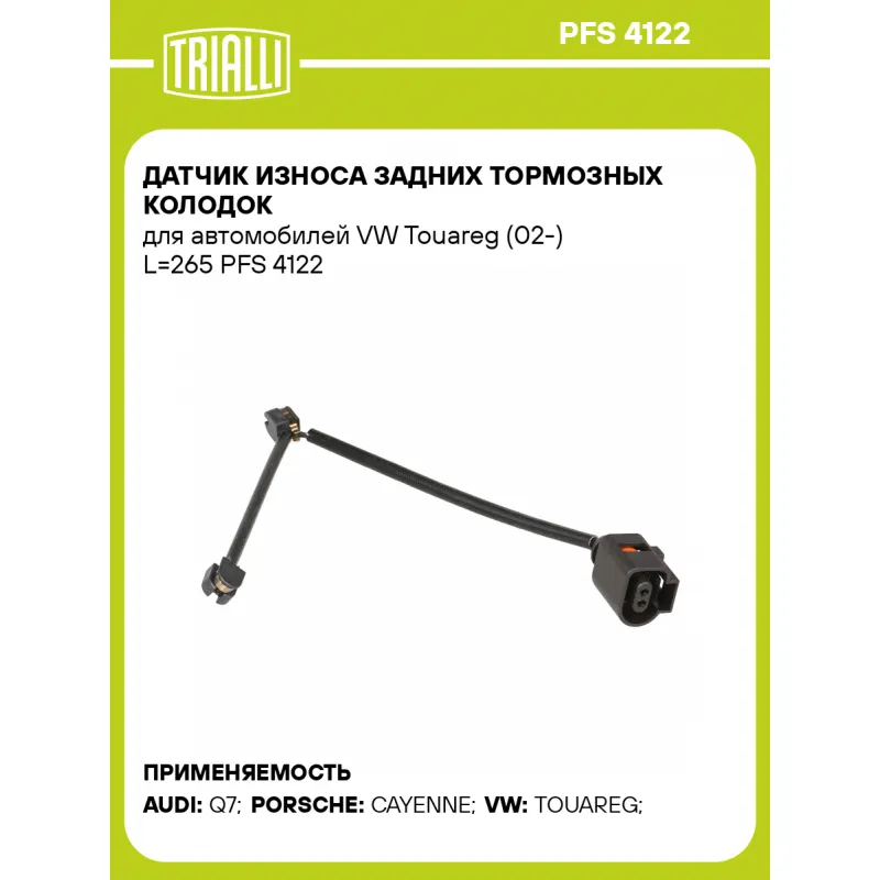 Датчик износа задних тормозных колодок для автомобилей VW Touareg (02-) L=265 Характеристики: Артикул: PFS 4122 OEM номера: 95561236520, 95561236530, 7L0907637B, 7L0907637C Необходимое количество: 2 на ось Количество на автомобиль: 2 Длина, мм: 265 Сторона установки: Задняя ось Гарантийный срок: 1 год / 30 000 км Товарная линейк... Читать полностью →