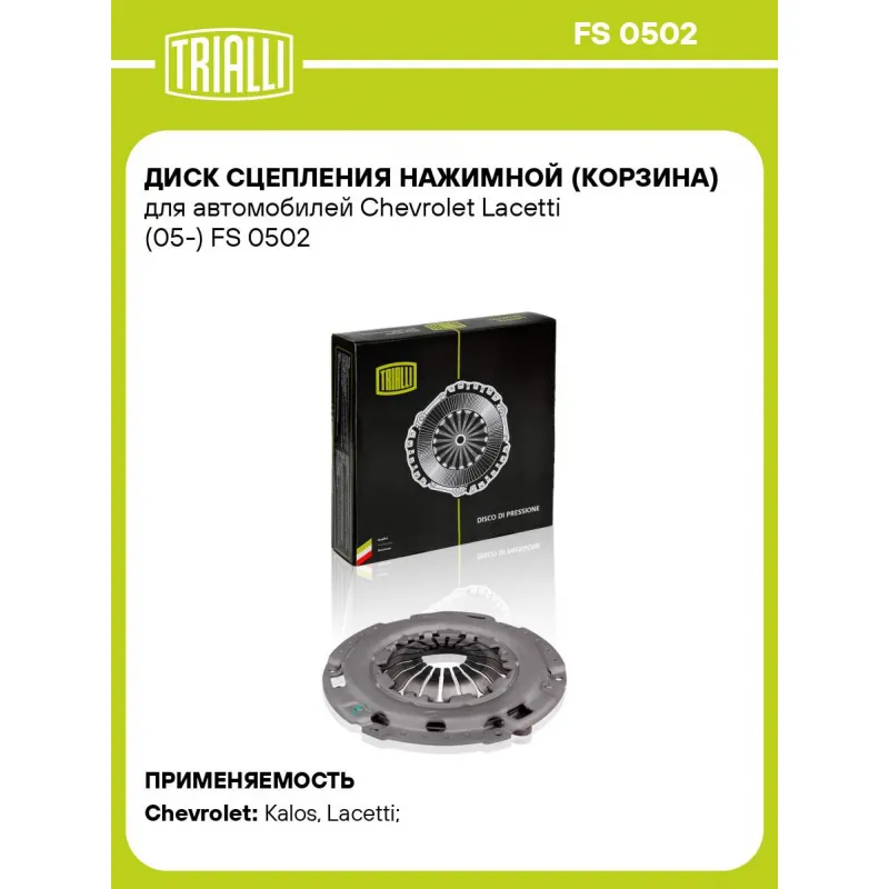 Диск сцепления нажимной (корзина) для автомобилей Chevrolet Lacetti (05-) Характеристики: Артикул: FS 0502 OEM номера: 96349031 Диаметр, мм: 218 Количество на автомобиль: 1 Сопутствующие товары:: FR 0502, FD 0502 Гарантийный срок: 2 года/60 000 км Диаметр диска, мм: 218 Сопутствующий товар: Комплекты сцепления: FR 0502,FR 0506, FR 0508 Сопутствующий товар: Ведомые диски сцепления: FD 0502 Товарная линейка: BLACK Подходит для авто: Chevrolet Kalos (05-), Lacetti (02-) Для проверки применяемости отправьте VIN автомобиля через вкладку "Есть вопросы о товаре?" Комплектация: Диск сцепления нажимной - 1 шт Гарантия: от 1 года.