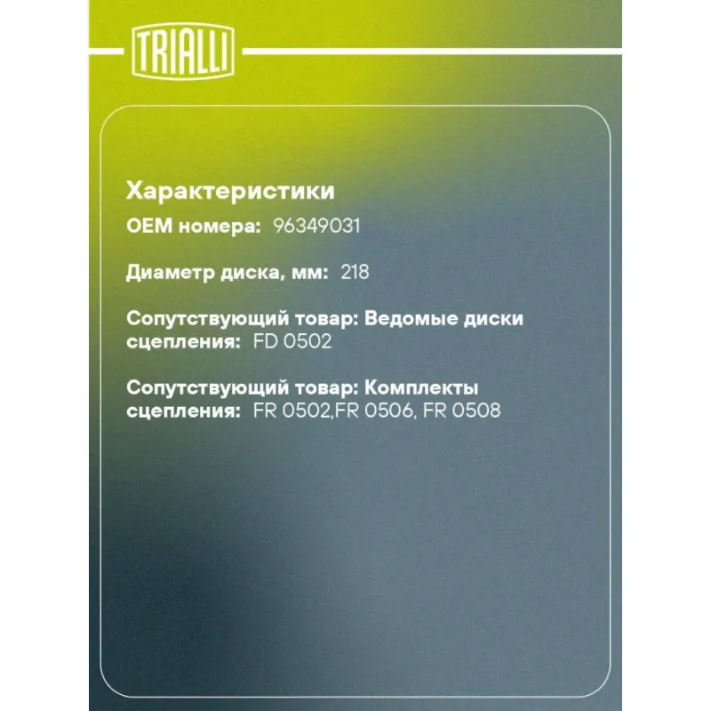 | Сопутствующий товар: Ведомые диски сцепления | FD 0502 |
