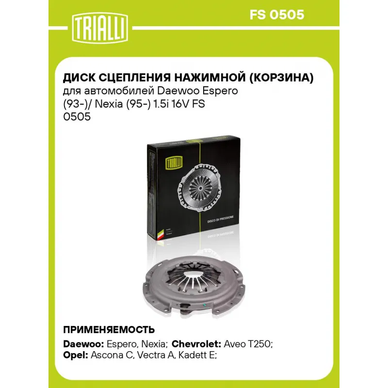 Диск сцепления нажимной (корзина) для автомобилей Daewoo Espero (93-)/ Nexia (95-) 1.5i 16V Характеристики: Артикул: FS 0505 OEM номера: R1170007, R90295130, 666 002, 666 024, 666 105, 666 112, 90342367, 90342368, 90350649, 90512590, 666 114, 90251356, 90251357, 90251378, 90273921, 90295130, 96182443, 90251377, 96181199 Диаметр, мм: 217 Количество на автомобиль: 1 Сопутствующие товары:: FR 0505, FD 0505 Гарантийный срок: 2 года/60 000 км Сопутствующий товар: Комплекты сцепления: FR 0505 Сопутствующий товар: Ведомые диски сцепления: FD 0505 Товарная линейка: BLACK Подходит для авто: Daewoo Espero (94-), Nexia (94-) Chevrolet Aveo T250 (06-) Opel Ascona C (81-), Vectra A (88-), Ascona C (81-), Kadett E (84-) Для проверки применяемости отправьте VIN автомобиля через вкладку "Есть вопросы о товаре?" Комплектация: Диск сцепления нажимной - 1 шт Гарантия: от 1 года.