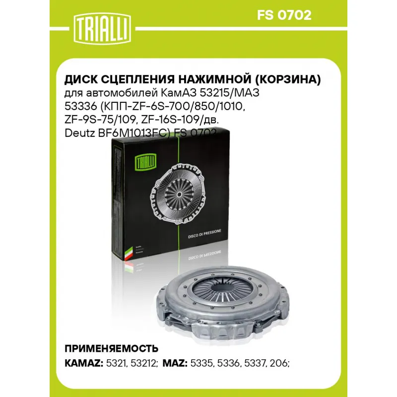 Диск сцепления нажимной (корзина) для автомобилей КамАЗ 53215/МАЗ 53336 (КПП-ZF-6S-700/850/1010, ZF-9S-75/109, ZF-16S-109/дв. Deutz BF6M1013FC) Характеристики: Артикул: FS 0702 OEM номера: 81.30305-0216, 81.30305-0223, 81.30305-9223, A 007 250 15 04, A 006 250 34 04, A 006 250 32 04, A 006 250 84 04, 007 250 15 04, 006 250 34 04, 007 250 15 04 80, 0062503204, 0062508404, 0421.346.00, 5654557, 3 482 123 833, 62503204, 62503404, 62508404, 72501504 Диаметр, мм: 396 Тип двигателя: Deutz BF6M1013FC Количество на автомобиль: 1 Гарантийный срок: 12 месяцев без ограничения по пробегу Сопутствующий товар: Ведомые диски сцепления: FD 0704; FD 0705 Товарная линейка: BLACK Тип КПП: ZF-6S-700/850/1010, ZF-9S-75/109, ZF-16S-109 Подходит для авто: КамаАЗ 5321, 53212, 5321, 53212, 53212 МАЗ 5335, 5336, 5335, 5336, 5337, 206 (07-) Для проверки применяемости отправьте VIN автомобиля через вкладку "Есть вопросы о товаре?" Комплектация: Диск сцепления нажимной - 1 шт Гарантия: от 1 года.