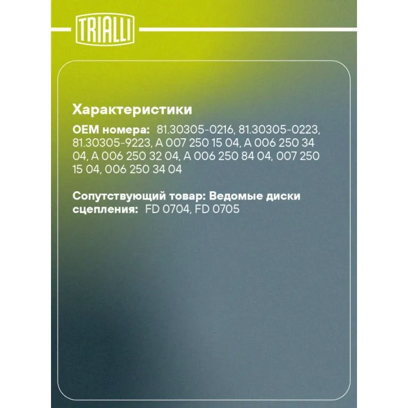 | Сопутствующий товар: Ведомые диски сцепления | FD 0704; FD 0705 |