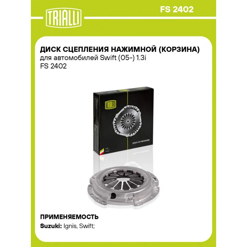 Диск сцепления нажимной (корзина) для автомобилей Swift (05-) 1.3i Характеристики: Артикул: FS 2402 OEM номера: 22100-60G20, 22100-63B50, 22100-64BA0, 22100-64B00, 22100-64B20, 22100-64B21, 22100-82410, 22100-86610 Диаметр, мм: 191 Количество на автомобиль: 1 Сопутствующие товары:: FR 2402, FD 2402 Гарантийный срок: 2 года/60 000 км Сопутствующий товар: Комплекты сцепления: FR 2402 Сопутствующий товар: Ведомые диски сцепления: FD 2402 Товарная линейка: BLACK Подходит для авто: Suzuki Ignis (03-), Swift (05-) Для проверки применяемости отправьте VIN автомобиля через вкладку "Есть вопросы о товаре?" Комплектация: Диск сцепления нажимной - 1 шт Гарантия: от 1 года.