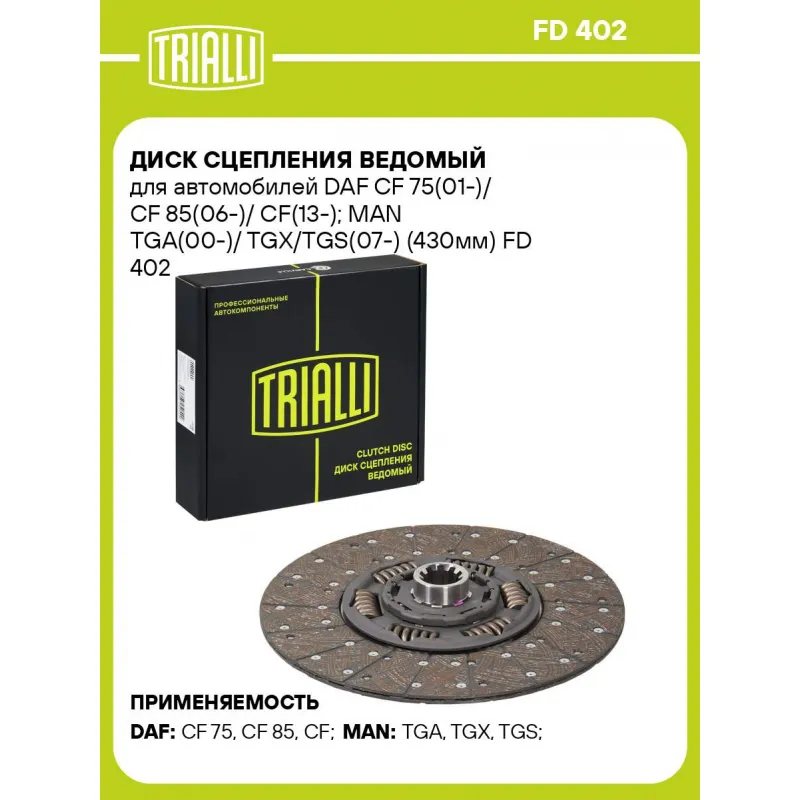 Диск сцепления ведомый для автомобилей DAF CF 75(01-)/ CF 85(06-)/ CF(13-); MAN TGA(00-)/ TGX/TGS(07-) (430мм) FD 402 TRIALLI