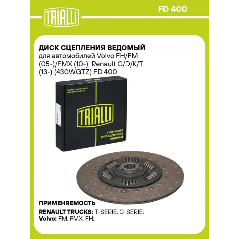 Диск сцепления ведомый для автомобилей Volvo FH/FM (05-)/FMX (10-); Renault C/D/K/T (13-) (430WGTZ) Характеристики: Артикул: FD 400 OEM номера: 74 20 994 737, 74 21 639 503, 74 20 725 523, 74 20 707 025, 21587809, 20994735, 85000240, 21527813, 85000534, 85003903, 21539802, 8172803, 21593944, 21593949, 85013334, 21615194, 21844676, 21587948, 20525015, 21844678, 85000238, 3191767, 20566389, 85003904, 20484468, 21587950 Гарантийный срок: 12 месяцев без ограничения по пробегу Количество на автомобиль: 1 Диаметр, мм: 430 Профиль ступицы: 46 x 50 - 24N Число зубцов, шт.: 24 Макс. крутящий момент: 3 300 N Сопутствующие товары:: FR 814, FR 815, FS 704, CT 120 Товарная линейка: BLACK Подходит для авто: RENAULT TRUCKS T-SERIE (13-), C-SERIE (13-), K-SERIE (13-), D-SERIE (13-) Volvo FM (05-), FMX (10-), FH (05-) Для проверки применяемости отправьте VIN автомобиля через вкладку "Есть вопросы о товаре?" Комплектация: Диск сцепления ведомый - 1 шт Гарантия: от 1 года.