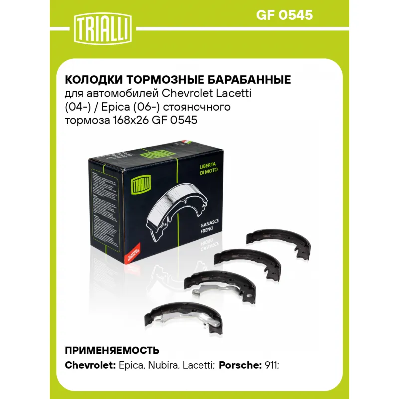 Колодки тормозные барабанные для автомобилей Chevrolet Lacetti (04-) / Epica (06-) стояночного тормоза 168x26 Характеристики: Артикул: GF 0545 OEM номера: 96496764, 97035299301, 96348197 Гарантийный срок: 1 год / 30 000 км Сторона установки: Задняя ось Количество на автомобиль: 1 Ширина, мм: 26 Особенности конструкции:: Стояночная тормозная система Диаметр, мм: 168 Сопутствующий товар: Барабаны тормозные: TF 051231 Товарная линейка: BLACK Сопутствующий товар: Шланги тормозные: BF 0580; BF 0581; BF 0582; BF 0583 Подходит для авто: Chevrolet Epica (06-), Nubira (05-), Epica (06-), Lacetti (02-) Porsche 911 (991) (11-) Для проверки применяемости отправьте VIN автомобиля через вкладку "Есть вопросы о товаре?" Комплектация: Колодка тормозная - 4 шт Гарантия: от 1 года.
