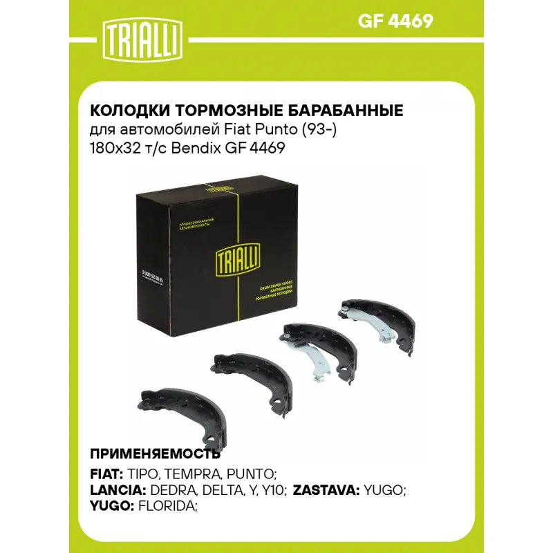 Колодки тормозные барабанные для автомобилей Fiat Punto (93-) 180x32 т/с Bendix Характеристики: Артикул: GF 4469 OEM номера: 77362425, 77362317, 71738376, 9948200, 5890500, 5888433 Особенности конструкции:: С рычагом стояночного тормоза Гарантийный срок: 1 год / 30 000 км Сторона установки: Задняя ось Количество на автомобиль: 1 Ширина, мм: 32 Диаметр, мм: 180 Тормозная система: Bendix Товарная линейка: BLACK Комплектация: Колодка тормозная - 4 шт Гарантия: от 1 года.