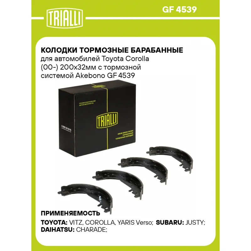Колодки тормозные барабанные для автомобилей Toyota Corolla (00-) 200x32мм с тормозной системой Akebono Характеристики: Артикул: GF 4539 OEM номера: 449552100, 449552090, 449552060, 044950D061, 449574040, 0449574040, 0449552090, 0449552060 Ширина, мм: 32 Диаметр, мм: 200 Гарантийный срок: 1 год / 30 000 км Сторона установки: Задняя ось Количество на автомобиль: 1 Товарная линейка: BLACK Комплектация: Колодка тормозная - 4 шт Гарантия: от 1 года.