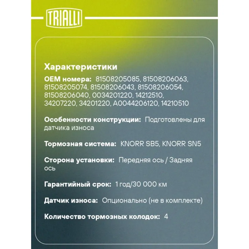 Колодки тормозные дисковые для автомобилей ГАЗ 33104, MAN, Mercedes (WVA № 29115) с монтажным комплектом Характеристики: Артикул: PFT 29115 OEM номера: 81508205085, 81508206063, 81508205074, 81508206043, 81508206054, 81508206040, 0034201220, 14212510, 34207220, 34201220, A0044206120, 14210510, A0084206620, 0004211110, A0014212610, A0014210610, 14212610, 0014210610, A0014212510, A0004211210, A0034206620, 14210610, 0004211010, 34207320, A0034207320, A0034207220, 4211210, 0034207320, 0034201120, 34206620, A0014210510, 0004211210, 0034207220, 0014210510, 0034206620, 34201120, 4211010, 0014212510, A0034201120, 0044206120, 0014212610, A0034201220, 44206120, A0004211010, 980107070, 0980107070, 9291042 Количество на автомобиль: 1 Сторона установки: Передняя ось / Задняя ось Особенности конструкции:: Подготовлены для датчика износа WVA: 29115 / 29148 / 29183 Тормозная система: KNORR SB5, KNORR SN5 Датчик износа: Опционально (не в комплекте) Количество тормозных колодок: 4 Дополнительная информация: С монтажным комплектом Ширина, мм: 174 Высота, мм: 84 Толщина 1, мм: 27 Толщина 2, мм: 33,8 Комплектация: Колодка тормозная - 4 шт Удерживающая пружина (металл) - 4 шт Палец (металл) - 2 шт., Шайба (металл) - 2 шт. Пружинный шплинт (металл) - 2 шт Адаптер регулирующего механизма (металл) - 1 шт Заглушка (резина) - 4 шт Гарантия: от 1 года.
