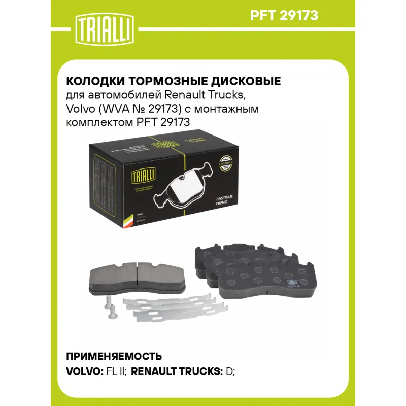 Колодки тормозные дисковые для автомобилей Renault Trucks, Volvo (WVA № 29173) с монтажным комплектом Характеристики: Артикул: PFT 29173 OEM номера: 5001864365, 74 21 399 915, 21352573, 20568715, 20526569, 20568712, 20560414, 21496551, 7421496556, 7422921065, 7422921058 Количество на автомобиль: 1 Сторона установки: Передняя ось / Задняя ось Особенности конструкции:: Подготовлены для датчика износа WVA: 29173 Тормозная система: Meritor Elsa 225-1 Датчик износа: Опционально (не в комплекте) Количество тормозных колодок: 4 Дополнительная информация: С монтажным комплектом Ширина, мм: 216 Высота, мм: 100 Толщина, мм: 29 Комплектация: Колодка тормозная - 4 шт Удерживающая пружина (металл) - 4 шт Болт (металл) - 2 шт Гарантия: от 1 года.