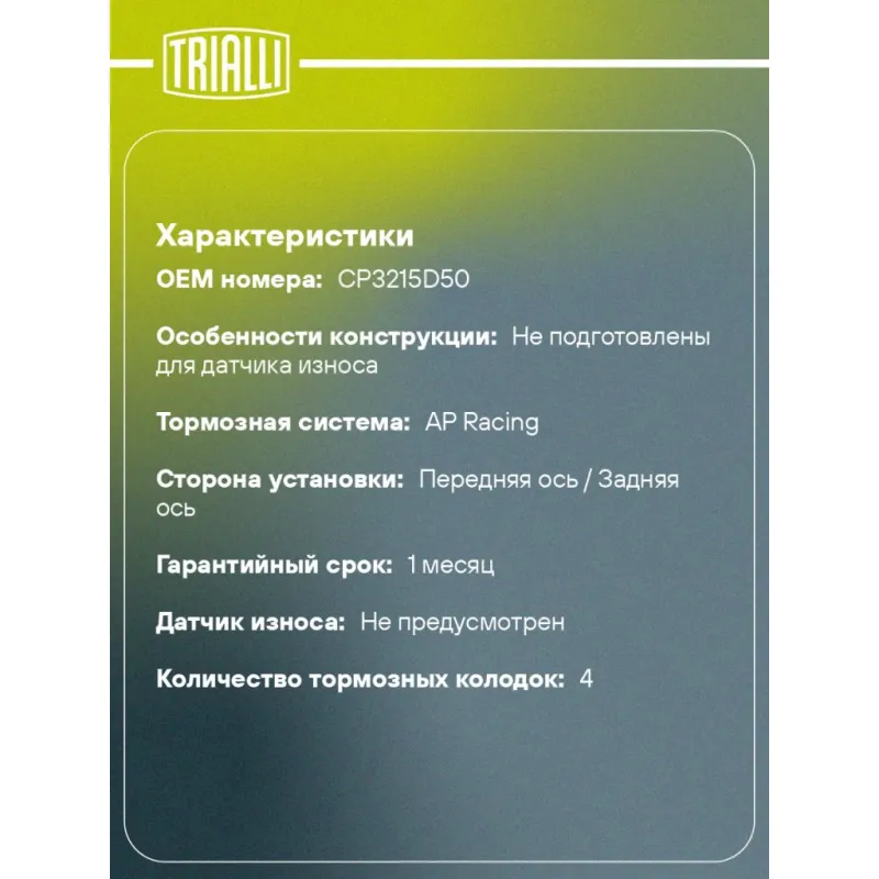| Особенности конструкции: | Не подготовлены для датчика износа |