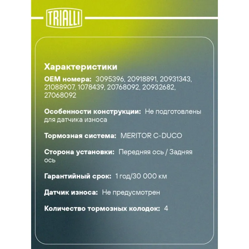 Колодки тормозные дисковые для автомобилей Volvo Trucks (WVA № 29125) с монтажным комплектом Характеристики: Артикул: PFT 29125 OEM номера: 3095396, 20918891, 20931343, 21088907, 1078439, 20768092, 20932682, 27068092 Количество на автомобиль: 1 Сторона установки: Передняя ось / Задняя ось Особенности конструкции:: Не подготовлены для датчика износа WVA: 29125 / 29277 Тормозная система: MERITOR C-DUCO Датчик износа: Не предусмотрен Количество тормозных колодок: 4 Дополнительная информация: С монтажным комплектом Ширина, мм: 250 Высота, мм: 111 Толщина, мм: 29 Комплектация: Удерживающая пружина (металл) - 4 шт Болт (металл) - 2 шт Колодка тормозная - 4 шт Гарантия: от 1 года.