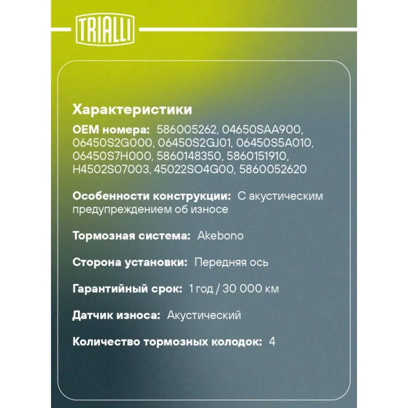 Колодки тормозные дисковые для автомобилей Honda Civic V (01-) / Civic VI (95-) / Jazz (02-) передние Характеристики: Артикул: PF 4216 OEM номера: 586005262, 04650SAA900, 06450S2G000, 06450S2GJ01, 06450S5A010, 06450S7H000, 5860148350, 5860151910, H4502S07003, 45022SO4G00, 5860052620, 5860052630, 5860052640, 5860092080, 5860092090, 5860095760, 45022SR7000, 45022SR7010, 45022ST7408, 45022ST7J00, 45022ST7J01, 45022ST7J02, 45022SAAE51, 45022SEAE50, 45022SO4505, 45022SR3000, 45022SR3G00, 45022SR3G01, 45022S07408, 45022S2G000, 45022S5A010, 45022S7H000, 45022SAA900, 45022SAA901, 45022S04J00, 45022S04J01, 45022S07000, 45022S07010, 45022S07020, 45022S07030, 45022S04409, 45022S04505, 45022S04E60, 45022S04G00, 45022S04G01, 45022S04G03, 06450SAA901, 06450SELT00, 45022504G00, 45022S04000, 45022S04010, 45022S04020, AY040HN011 Количество на автомобиль: 1 Сторона установки: Передняя ось Особенности конструкции:: С акустическим предупреждением об износе WVA: 21697, 21698, 21699 Тормозная система: Akebono Гарантийный срок: 1 год / 30 000 км Датчик износа: Акустический Количество тормозных колодок: 4 Сопутствующий товар: Диски тормозные: DF 230120 Ширина, мм: 131,5 Высота, мм: 54,5 Толщина, мм: 15 Подходит для авто: Honda Civic V (91-), Civic VI (95-), Jazz (01-) Для проверки применяемости отправьте VIN автомобиля через вкладку "Есть вопросы о товаре?" Комплектация: Колодка тормозная - 4 шт Гарантия: от 1 года.