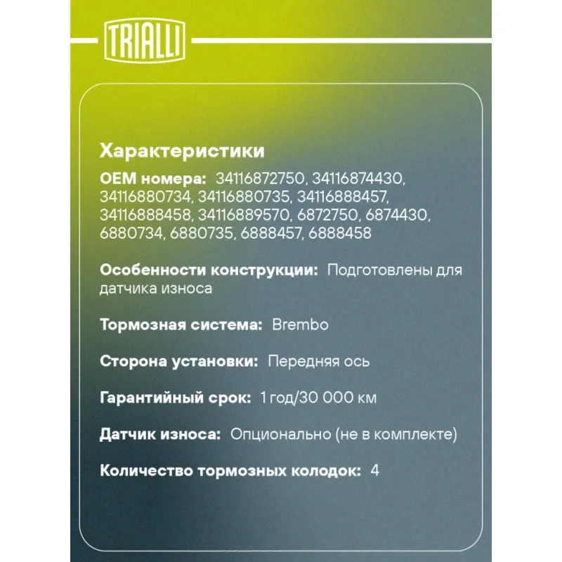 | Датчик износа | Опционально (не в комплекте) |