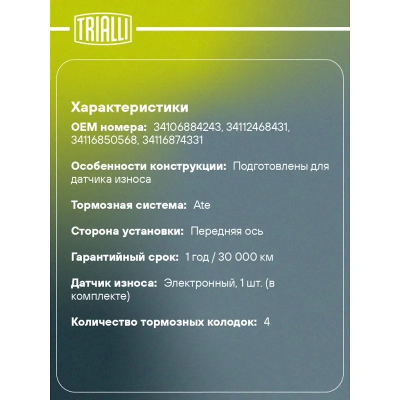 | Гарантийный срок | 1 год / 30 000 км |