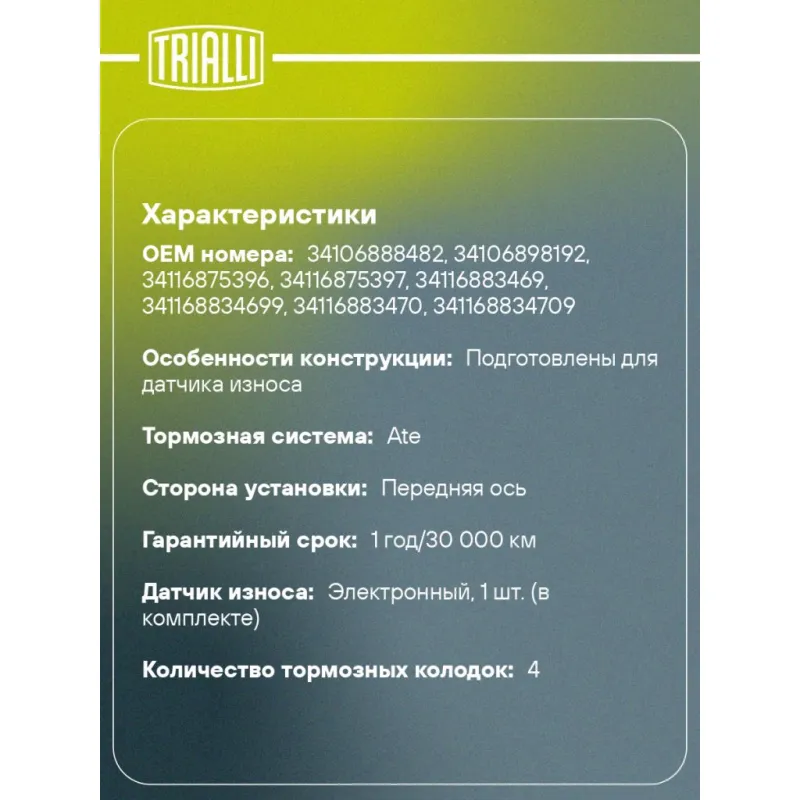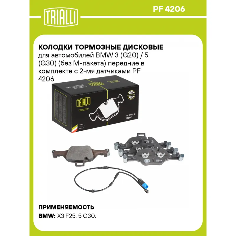 Колодки тормозные дисковые для автомобилей BMW 3 (G20) / 5 (G30) (без М-пакета) передние в комплекте с 2-мя датчиками Характеристики: Артикул: PF 4206 OEM номера: 34106888482, 34106898192, 34116875396, 34116875397, 34116883469, 341168834699, 34116883470, 341168834709 Количество на автомобиль: 1 Сторона установки: Передняя ось Особенности конструкции:: Подготовлены для датчика износа WVA: 25900, 25901 Тормозная система: Ate Датчик износа: Электронный, 1 шт. (в комплекте) Количество тормозных колодок: 4 Сопутствующий товар: Диски тормозные: DF 263917 Ширина, мм: 219 Высота, мм: 85 Толщина, мм: 19 Подходит для авто: BMW X3 F25 (10-), 5 G30 (16-) Для проверки применяемости отправьте VIN автомобиля через вкладку "Есть вопросы о товаре?" Комплектация: Датчик износа - 1 шт Колодка тормозная - 4 шт Гарантия: от 1 года.