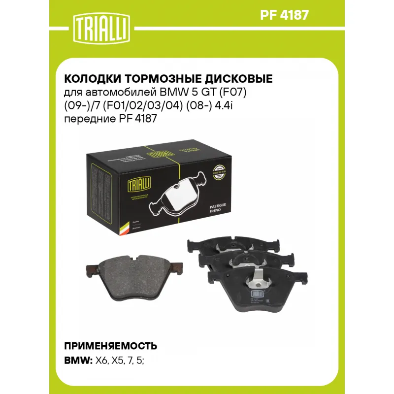 Колодки тормозные дисковые для автомобилей BMW 5 GT (F07) (09-)/7 (F01/02/03/04) (08-) 4.4i передние Характеристики: Артикул: PF 4187 OEM номера: 34116775326, 34116794464, 34116792874, 34116791527, 34116783554, 34114065325 Количество на автомобиль: 1 Сторона установки: Передняя ось Особенности конструкции:: Подготовлены для датчика износа WVA: 24436, 24437 Тормозная система: Ate Гарантийный срок: 1 год / 30 000 км Датчик износа: Опционально Количество тормозных колодок: 4 Ширина, мм: 193 Высота, мм: 97 Толщина, мм: 20 Сопутствующий товар:: датчики износа Комплектация: Колодка тормозная - 4 шт Гарантия: от 1 года.