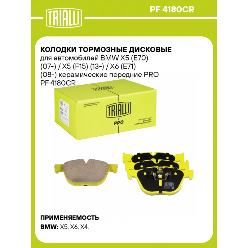 Колодки тормозные дисковые для автомобилей BMW X5 (E70) (07-) / X5 (F15) (13-) / X6 (E71) (08-) керамические передние PRO Характеристики: Артикул: PF 4180CR OEM номера: 34112413038, 34112413052, 34112413068, 34114074370, 34116778403, 34116779293, 34116852253, 34116857096, 34116877653 Особенности конструкции:: Подготовлены для датчика износа Гарантийный срок: 1 год / 30 000 км Количество на автомобиль: 1 Сторона установки: Передняя ось Тормозная система: Ate Датчик износа: Опционально (не в комплекте) Количество тормозных колодок: 4 Ширина 1, мм: 171,1 Ширина 2, мм: 170,2 Высота, мм: 76,8 Толщина 1, мм: 20,2 Толщина 2, мм: 20,9 Материал фрикционной накладки: Ceramic Товарная линейка: PRO Комплектация: Колодка тормозная - 4 шт Гарантия: от 1 года.