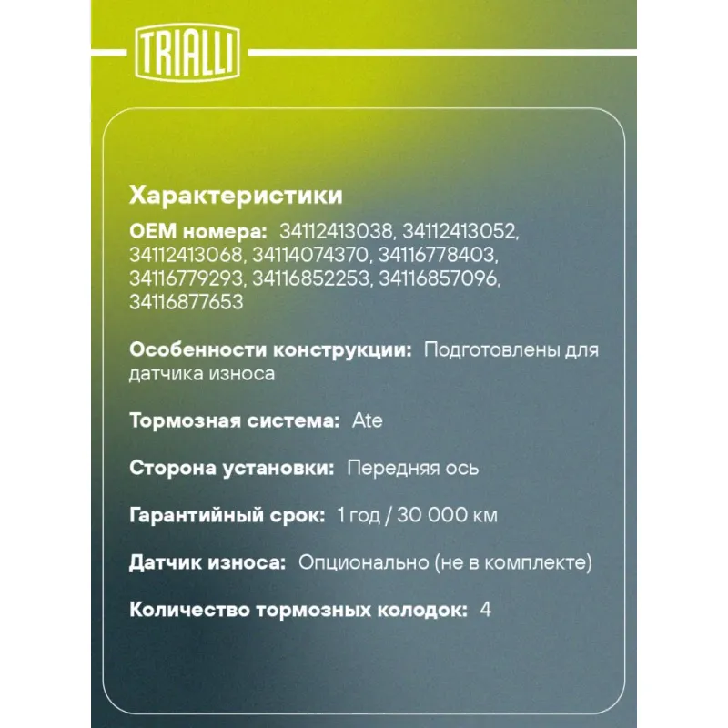 | Особенности конструкции: | Подготовлены для датчика износа |