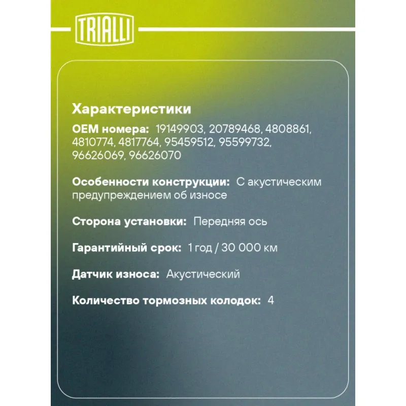 | Гарантийный срок | 1 год / 30 000 км |
