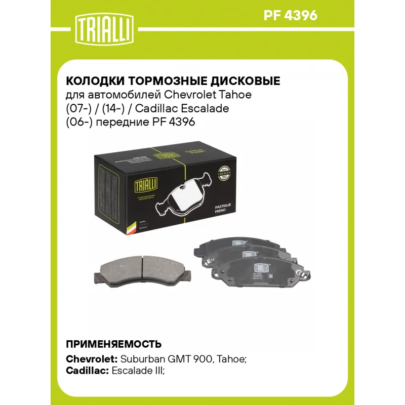 Колодки тормозные дисковые для автомобилей Chevrolet Tahoe (07-) / (14-) / Cadillac Escalade (06-) передние Характеристики: Артикул: PF 4396 OEM номера: 19285993, 19368513, 19369415, 23135915, 23487649, 25910429, 84218390, 84218394, 84233332, 84320501, 89059119, 25918342, 25918341, 25910432, 25910431, 25910430, 25852957, 22742382, 19257667, 19157524 Количество на автомобиль: 1 Сторона установки: Передняя ось Особенности конструкции:: С акустическим предупреждением об износе Тормозная система: Akebono Датчик износа: Акустический Количество тормозных колодок: 4 Ширина, мм: 184 Высота 1, мм: 60 Высота 2, мм: 64 Толщина, мм: 18 Подходит для авто: Chevrolet Suburban GMT 900 (07-), Tahoe (06-) Cadillac Escalade III (06-), Escalade III (06-) Для проверки применяемости отправьте VIN автомобиля через вкладку "Есть вопросы о товаре?" Комплектация: Колодка тормозная - 4 шт Гарантия: от 1 года.