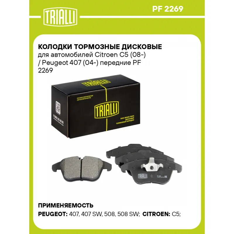 Колодки тормозные дисковые для автомобилей Citroen C5 (08-) / Peugeot 407 (04-) передние Характеристики: Артикул: PF 2269 OEM номера: 425403, 425424, 4254A7, E172294, 4254.38, 1609253180, 1610103880, 1617283280, 1619790280, 1647862980, 1610103780, 1647863380 Особенности конструкции:: Подготовлены для датчика износа Гарантийный срок: 1 год / 30 000 км Количество на автомобиль: 1 Сторона установки: Передняя ось Датчик износа: Опционально (не в комплекте) Количество тормозных колодок: 4 Дополнительная информация: С поршневыми зажимами Ширина, мм: 155.2 Высота 1, мм: 71.9 Высота 2, мм: 66.6 Толщина, мм: 18.5 Комплектация: Колодка тормозная - 4 шт Гарантия: от 1 года.