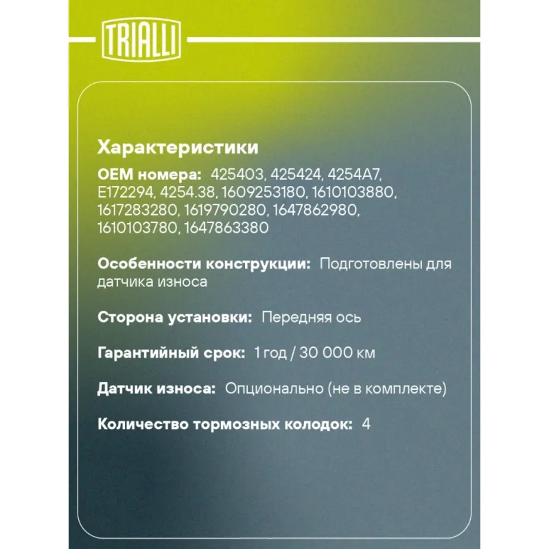 | Датчик износа | Опционально (не в комплекте) |