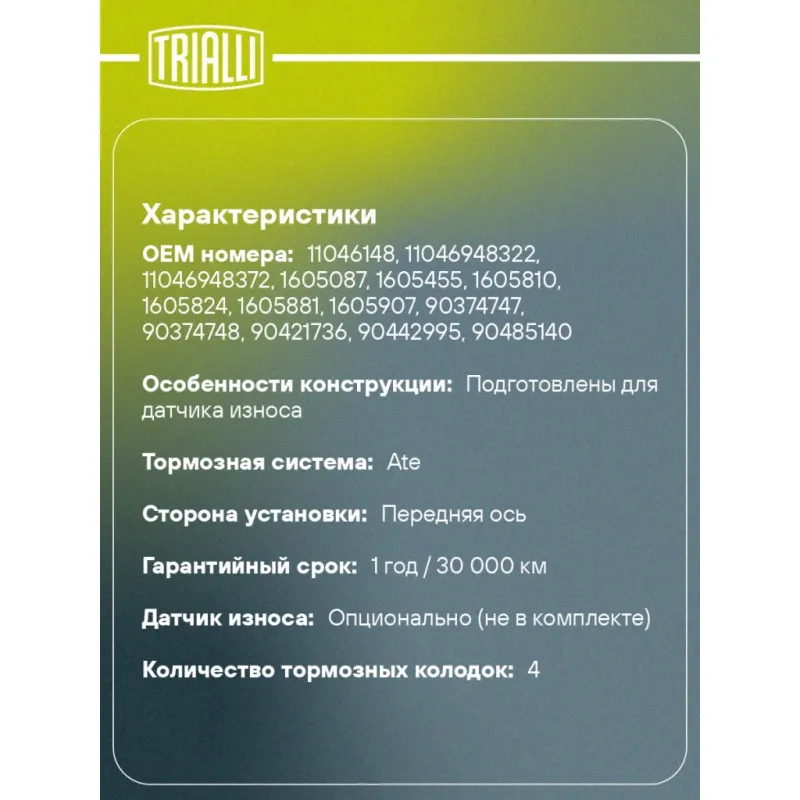 | Датчик износа | Опционально (не в комплекте) |